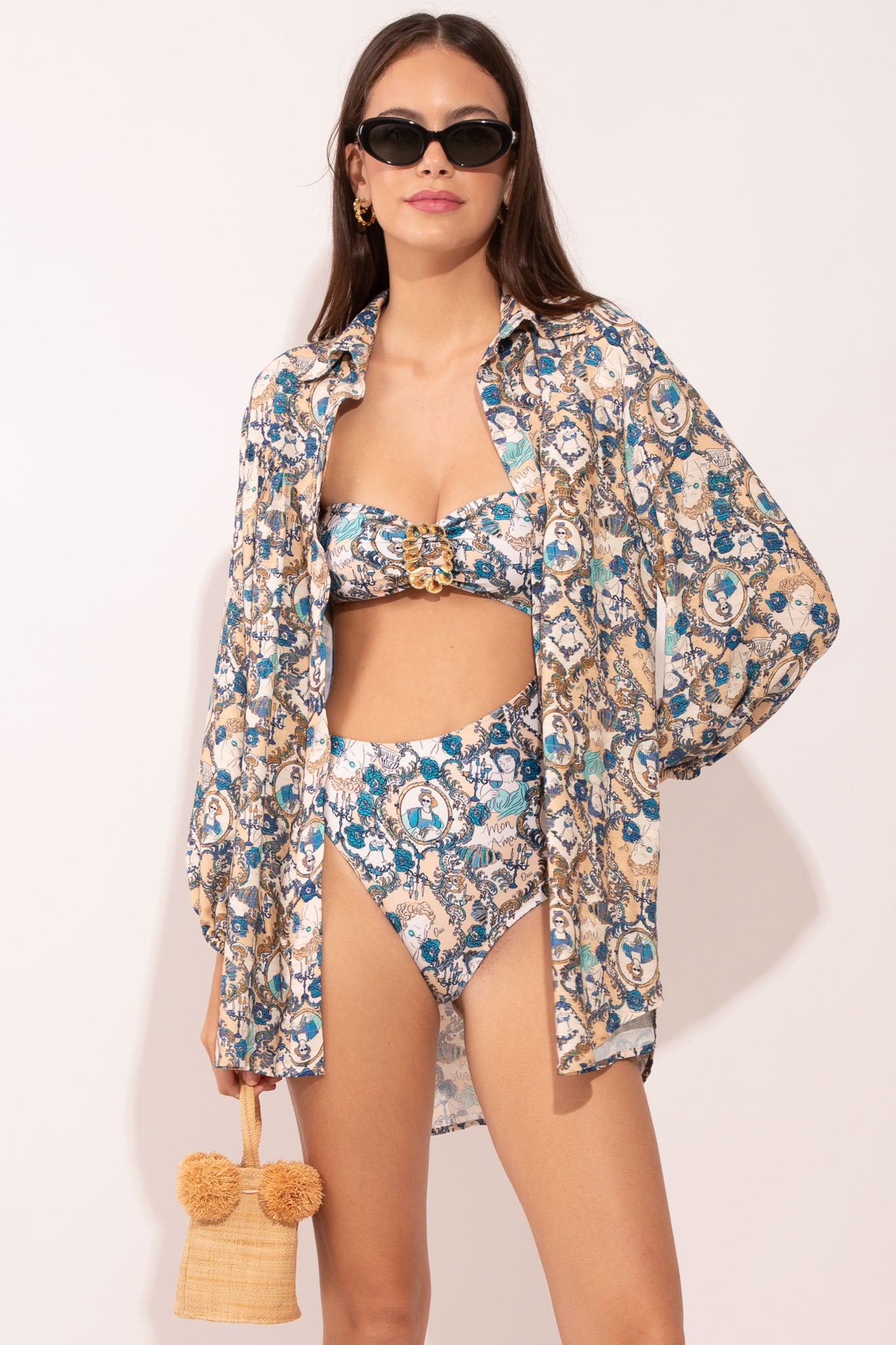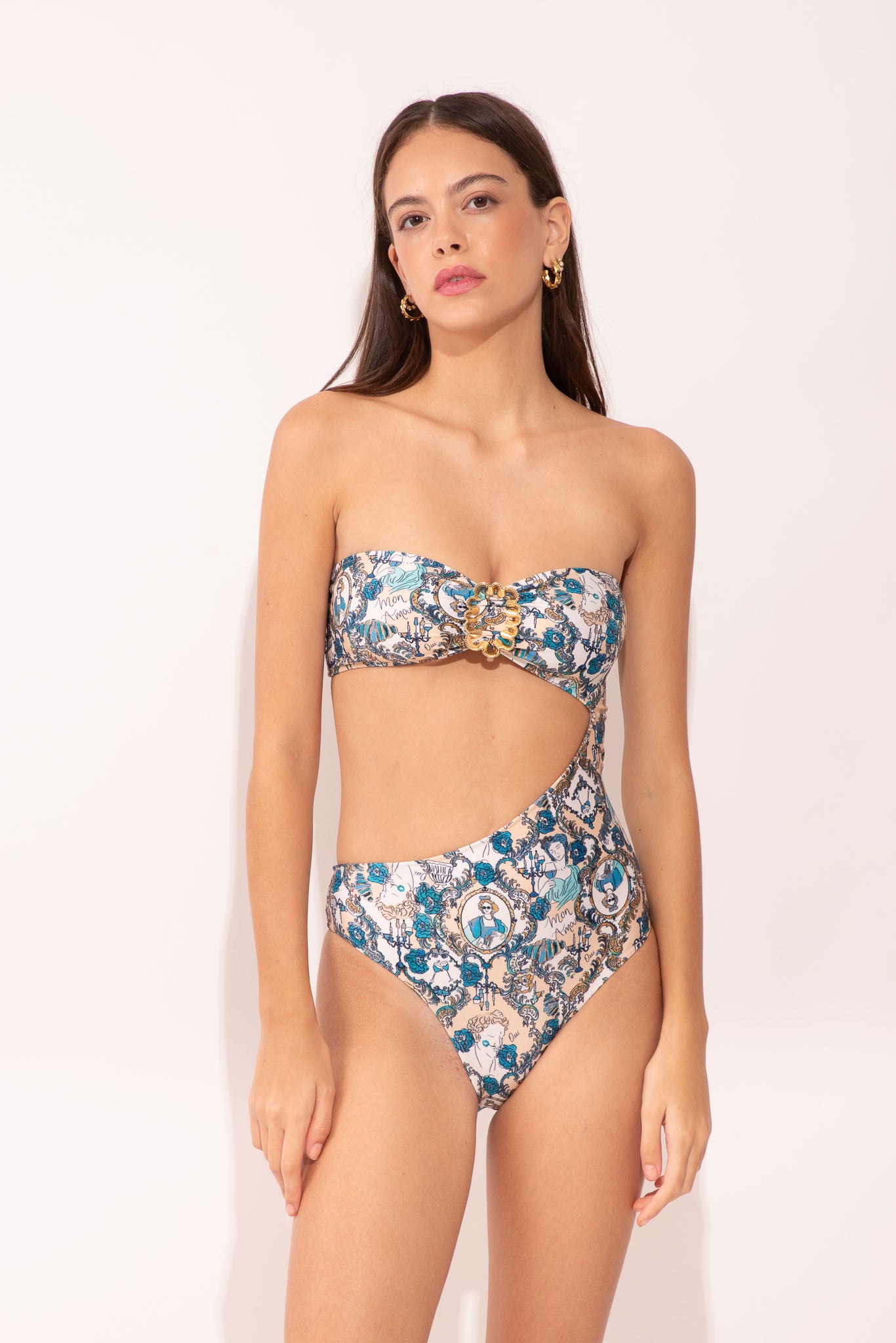 Strapless one-piece with a straight neckline and an asymmetric side cut-out that highlights the waist. The central gold buckle detail gives the piece strength and extra allure. Perfect worn as a daring swimsuit or styled as a bodysuit for night looks.